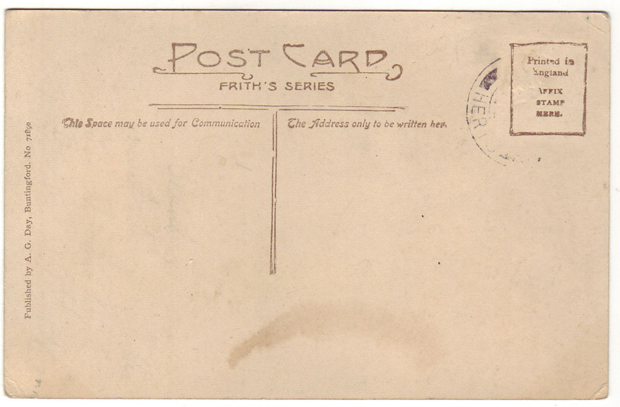 Again published by E.E.Darville the stationers in Buntingford with a postmark of Buntingford on 29th July 1908. Very similar to the first postcard - the difference being the credit for the stationers is on the front of the card rather than the reverse, the same image is used on both cards.